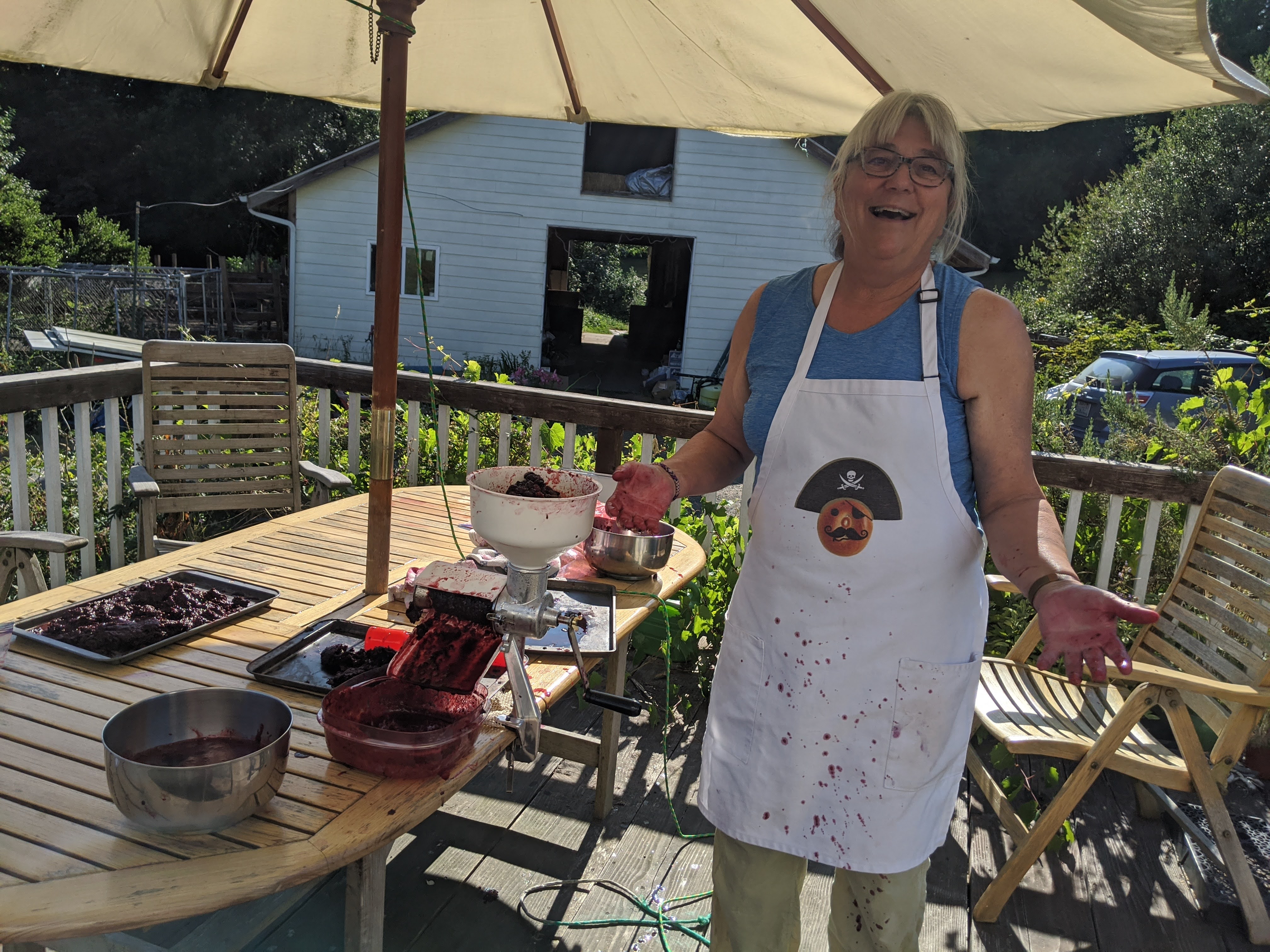 Usually a friend brings over her vintage Squeezo Strainer and we process bags of thawed berries. It is a day of jam making and conversation. But she moved away and I had to come up with another solution. I tried a Norpro SauceMaster with a berry screen. It did remove the seeds, but it had a habit of splurting out the resulting pulp. I moved the whole operation outdoors where I could rinse off my work area with a hose afterwards. Despite the mess, the jam turned out to be wonderful.