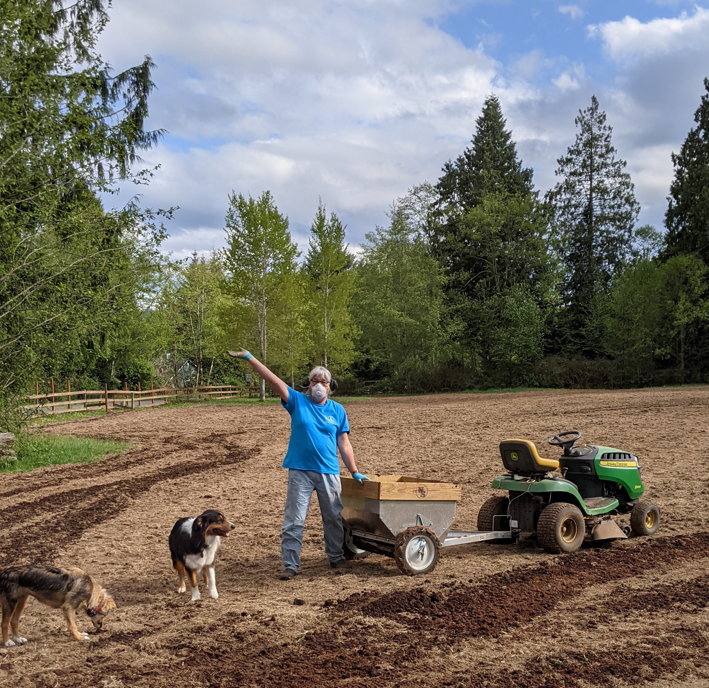 We decided to replant a couple of our horse pastures this year. Used to be, you would go to your local feed store and ask them who they recommended for tilling and replanting a pasture. Used to be, there were always a couple older guys around who did this. They would bring over a small tractor with all the needed implements and do the job. But ‘used to be’ isn’t now. Nobody is doing this sort of work for hire around here. We had to become the old guys who put in pasture. We acquired a tiller and used it hour after hour, tilling up the clover and weeds that were taking over the grass. We filled in the holes and the dips in the field. We spent hours picking up rocks. We tracked down horse pasture seed – this was tricky because there is a shortage of pasture seed. We searched all the local feed stores and found just enough seed. Then we needed to get the manure spreader. We found a place in Washougal that sold the spreader, and after a long day of driving we made it home with the device.